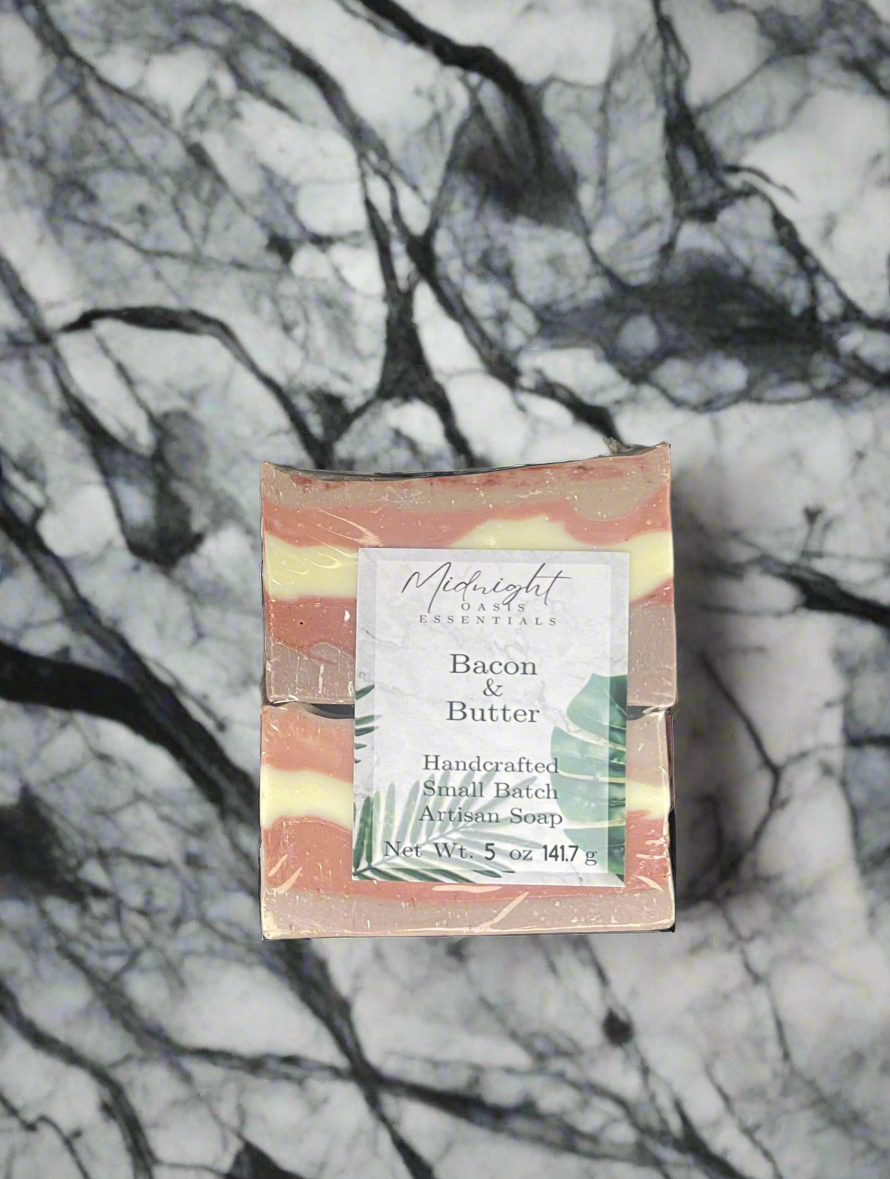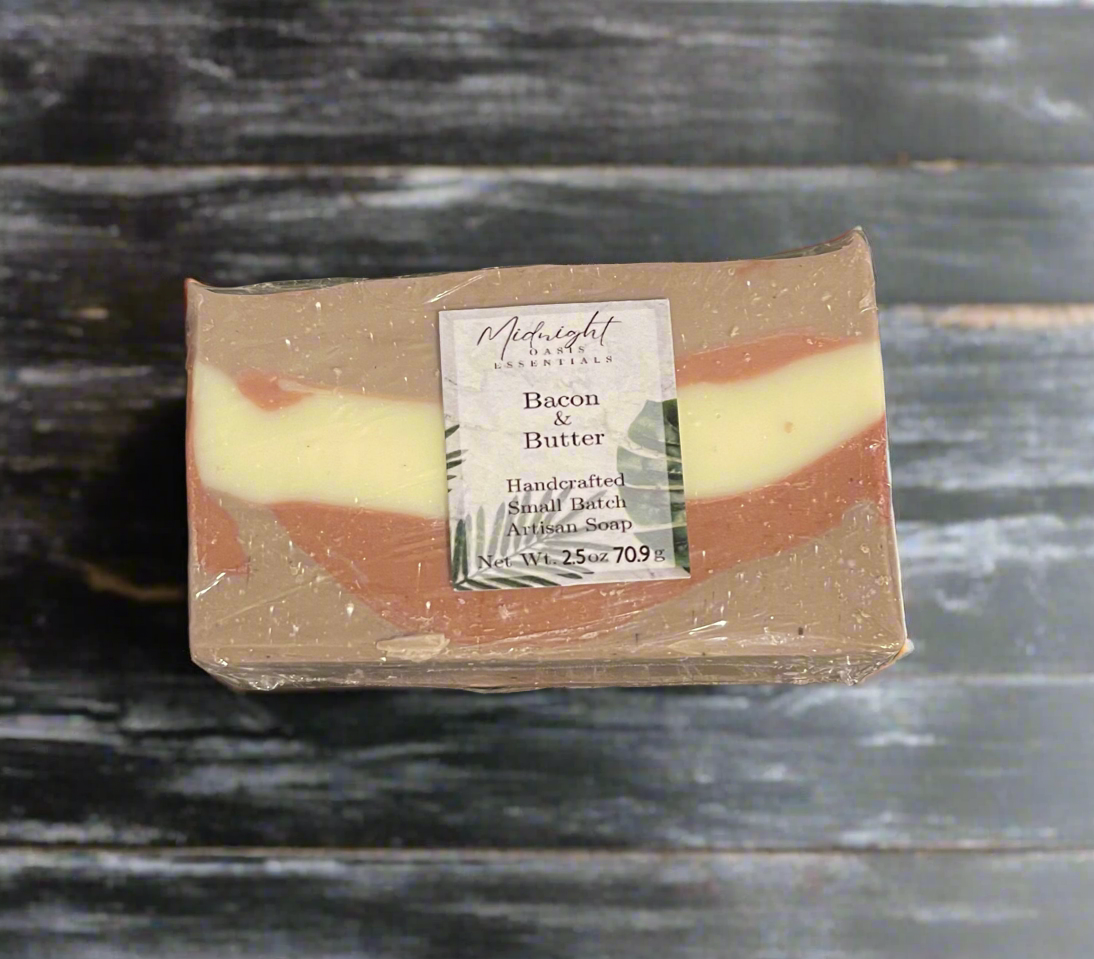 Bacon & Butter Bar Soap is a handcrafted cold process soap that delivers rich nourishment with a touch of rugged indulgence. Infused with the mouthwatering aroma of smoky bacon, softened with creamy butter notes, and finished with a subtle peppery edge, this bar is as bold as it is smooth.
