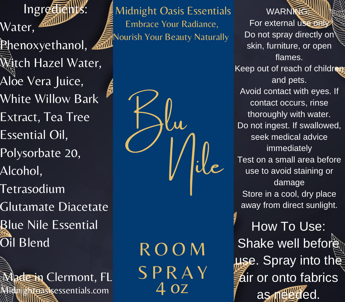 Refresh your space with our premium Room Spray, designed to create a clean, inviting atmosphere in any environment. Infused with the purifying power of Witch Hazel Water and Aloe Vera Juice, this spray works to naturally freshen and uplift your surroundings. White Willow Bark Extract and Tea Tree Essential Oil deliver a clean and crisp finish, while the enchanting Blu Nile Essential Oil Blend fills the air with an elegant, calming aroma.