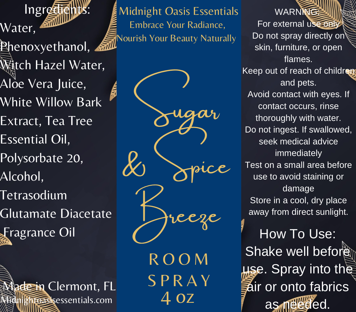 Ingredients: Water, Phenoxyethanol, Witch Hazel Water, Aloe Vera Juice, White Willow Bark Extract, Tea Tree Essential Oil, Polysorbate 20, Alcohol, Tetrasodium Glutamate Diacetate, Sugared Snickerdoodle Fragrance Oil, Oatmeal Honey & Milk Fragrance Oil